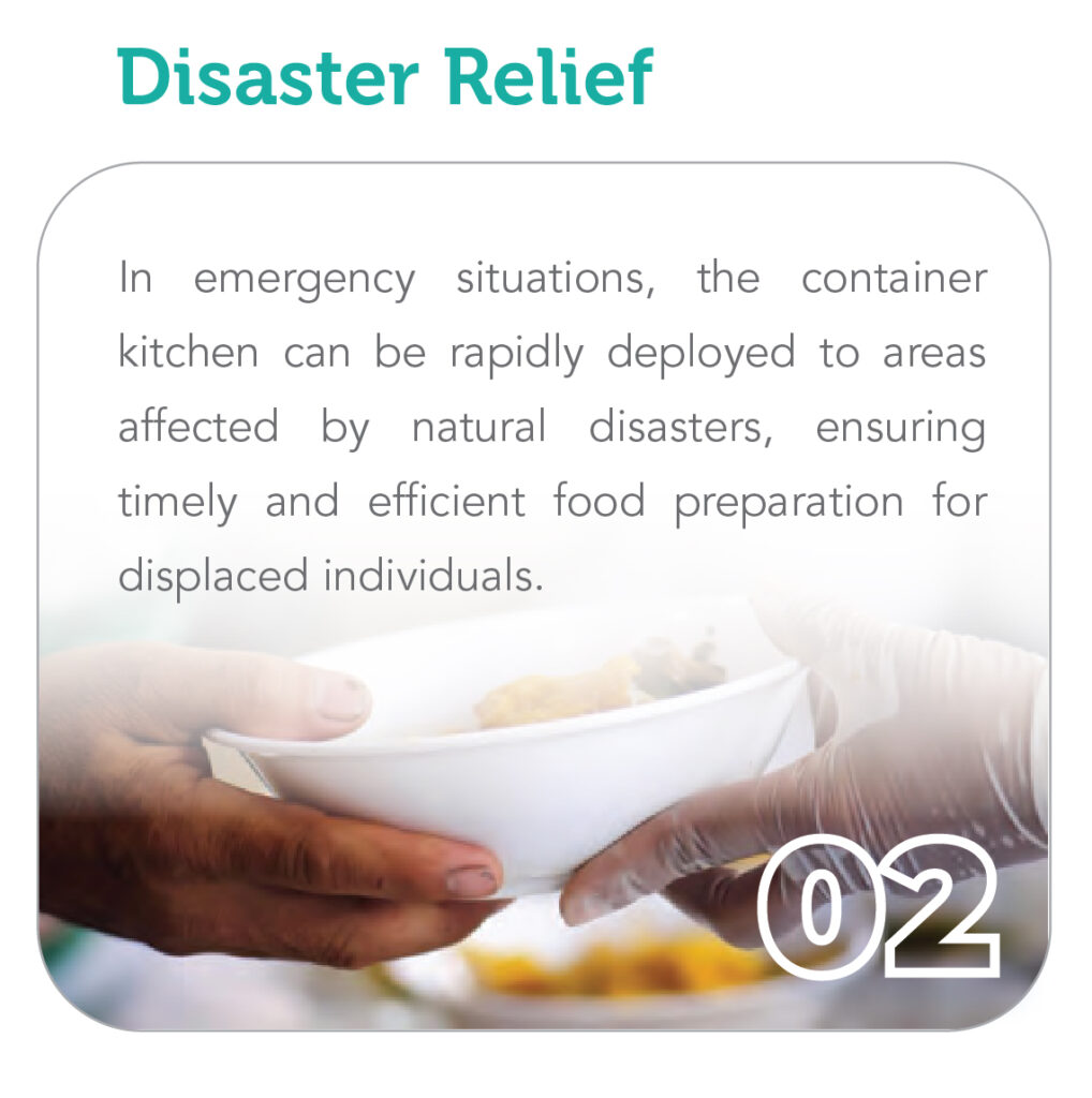 When crisis strikes and infrastructure is damaged or inaccessible, response time becomes critical. Container kitchens can be rapidly deployed to provide hot, safe meals to emergency teams and displaced communities when they need it most. Each unit includes ventilation, cold and dry storage, prep and wash areas—everything needed to sustain large-scale meal service under challenging conditions. The self-contained design means they can operate independently, making them ideal for emergency response.